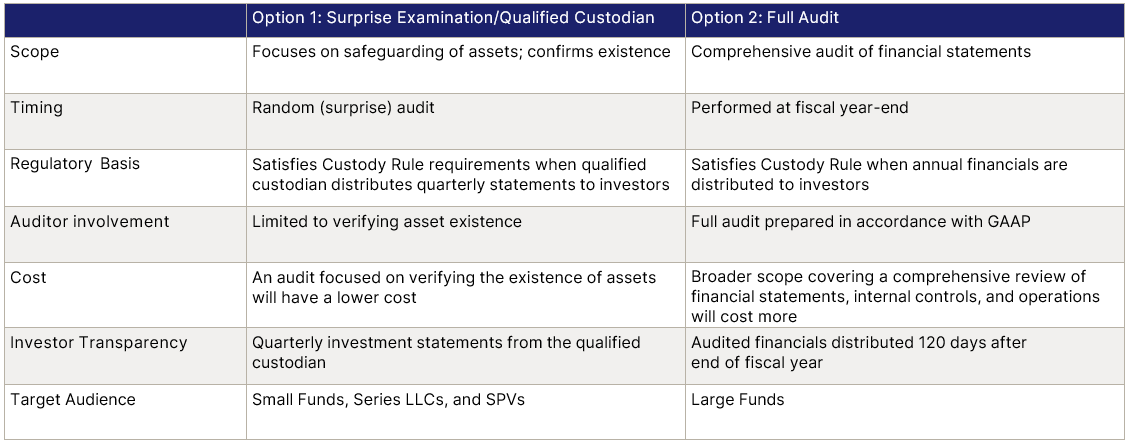Both compliance paths meet the requirements of the SEC Custody Rule, which is fundamentally designed to safeguard client assets from misappropriation and misuse, and to promote transparency. Fund managers should evaluate both options carefully to determine which approach best aligns with their fund structure, investor expectations, and long-term compliance strategy.